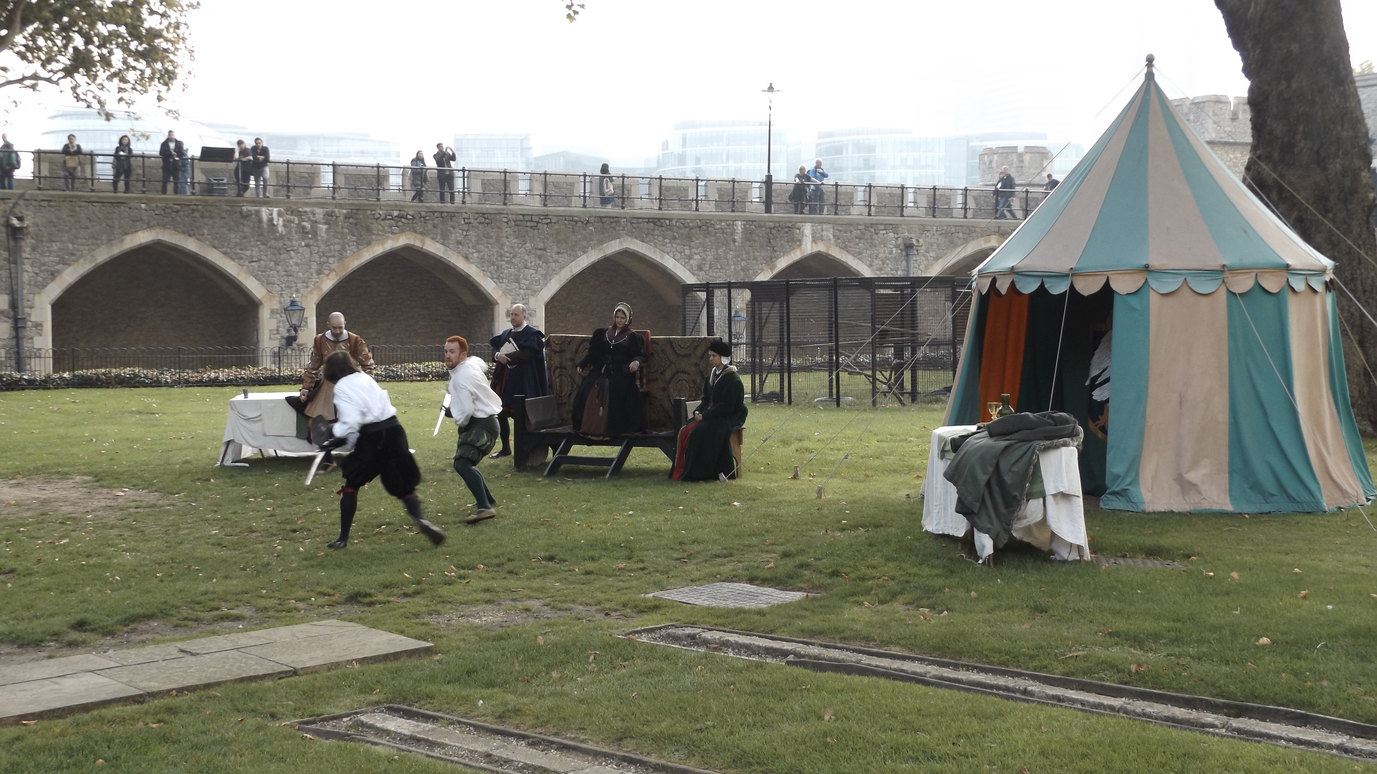 The next afternoon, we took the hop on hop off bus and went around to the Tour of London. The Tower was really cool. We did the Beefeater tour, which was very entertaining. At the Tower, we saw the Crown Jewels, the Torture room, the Green where Henry VIII’s wives (and many others) were beheaded. They also had a “tournament” going on where two guys were sword fighting…it was pretty cool. Hayden liked watching the sword fighting. Walking around the Tower was really amazing. To think that parts of it are almost 1,000 years old and to think about all of the history that has happened here is pretty crazy. I’m reading a series of books now that is about the Tudors and that time in England and it’s really interesting to see all of the places that I have been reading about.