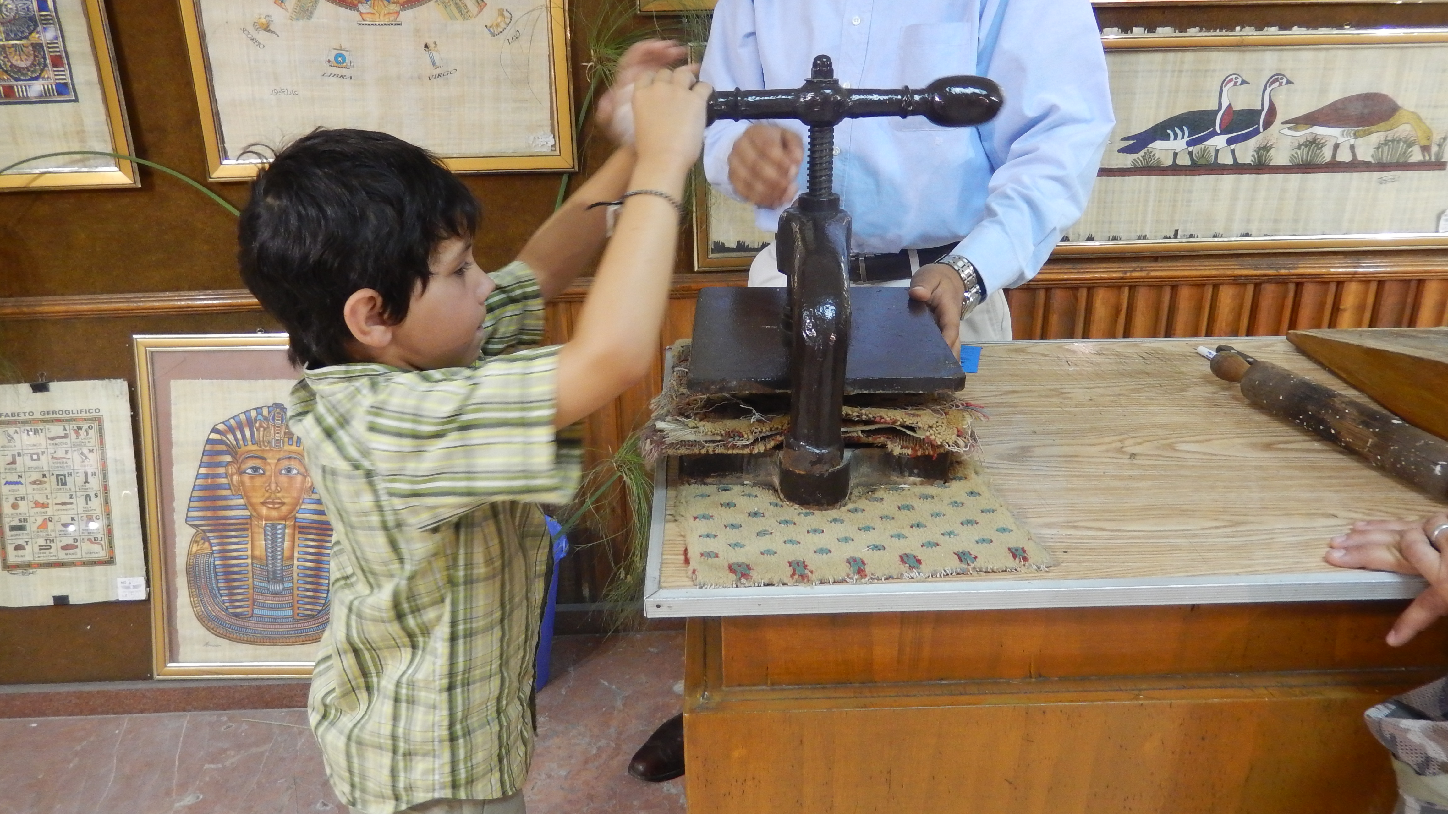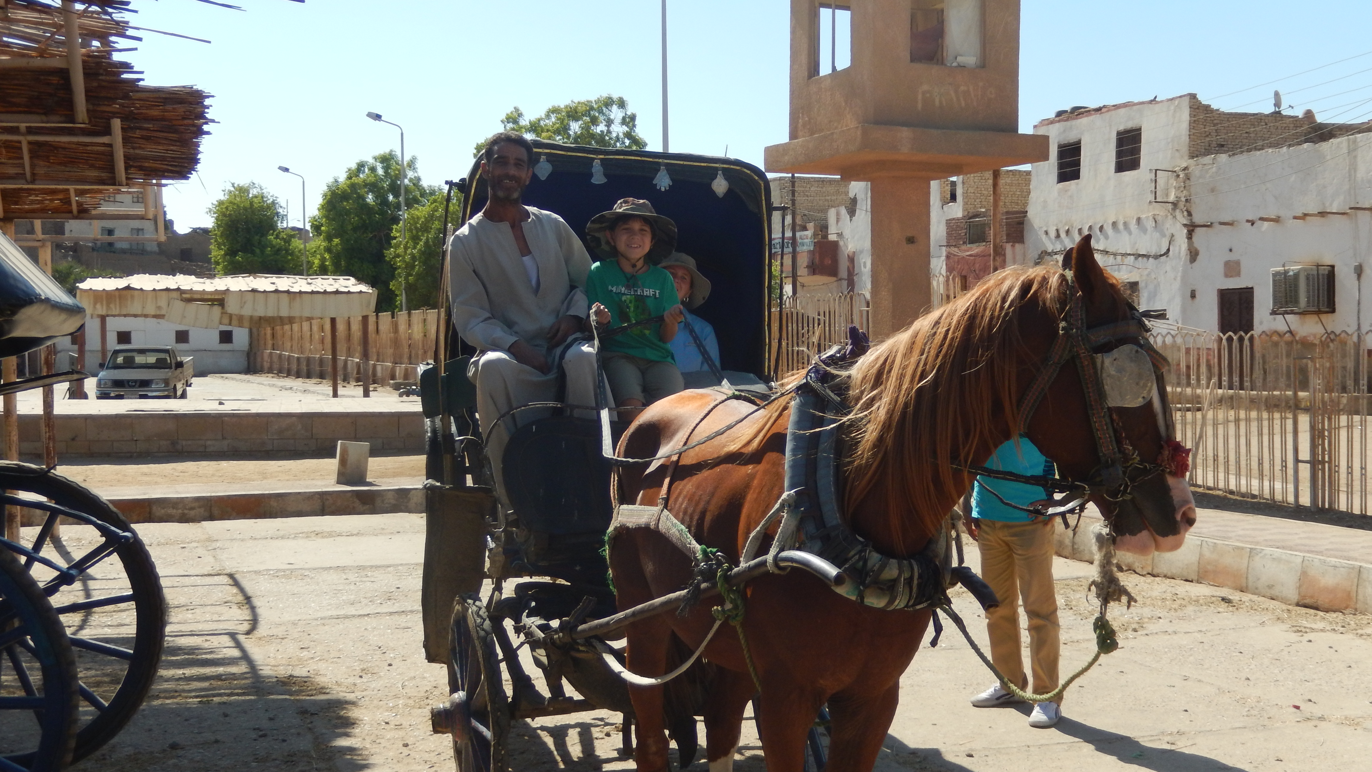 First thing the next morning, we went to visit the Edfu temple. Edfu was a lot like the Philae temple, but with less damage to the carvings. I think the highlight of Edfu was that we took a horse carriage out to the temple. The driver even let Hayden sit in the front and drive on the way back…he loved it! That afternoon, we sailed up to Luxor and went through a lock on the way up. Inside of the lock, there were guys on boats selling souvenirs to the tourists…it was crazy. They would throw towels, blankets, and stuff up on the boat and try to get people to keep it and throw them back money. At one point, the guy sold something to some people, but they were taking forever to pay so he had to tie his tiny little raft on to the boat and get drug along until they paid. I think I would be afraid of getting smushed!! That evening, we had an Egyptian dinner and it was very good. There was a belly dancing show later, but we were pooped and fell asleep before it even started. (I know, we’re party animals).